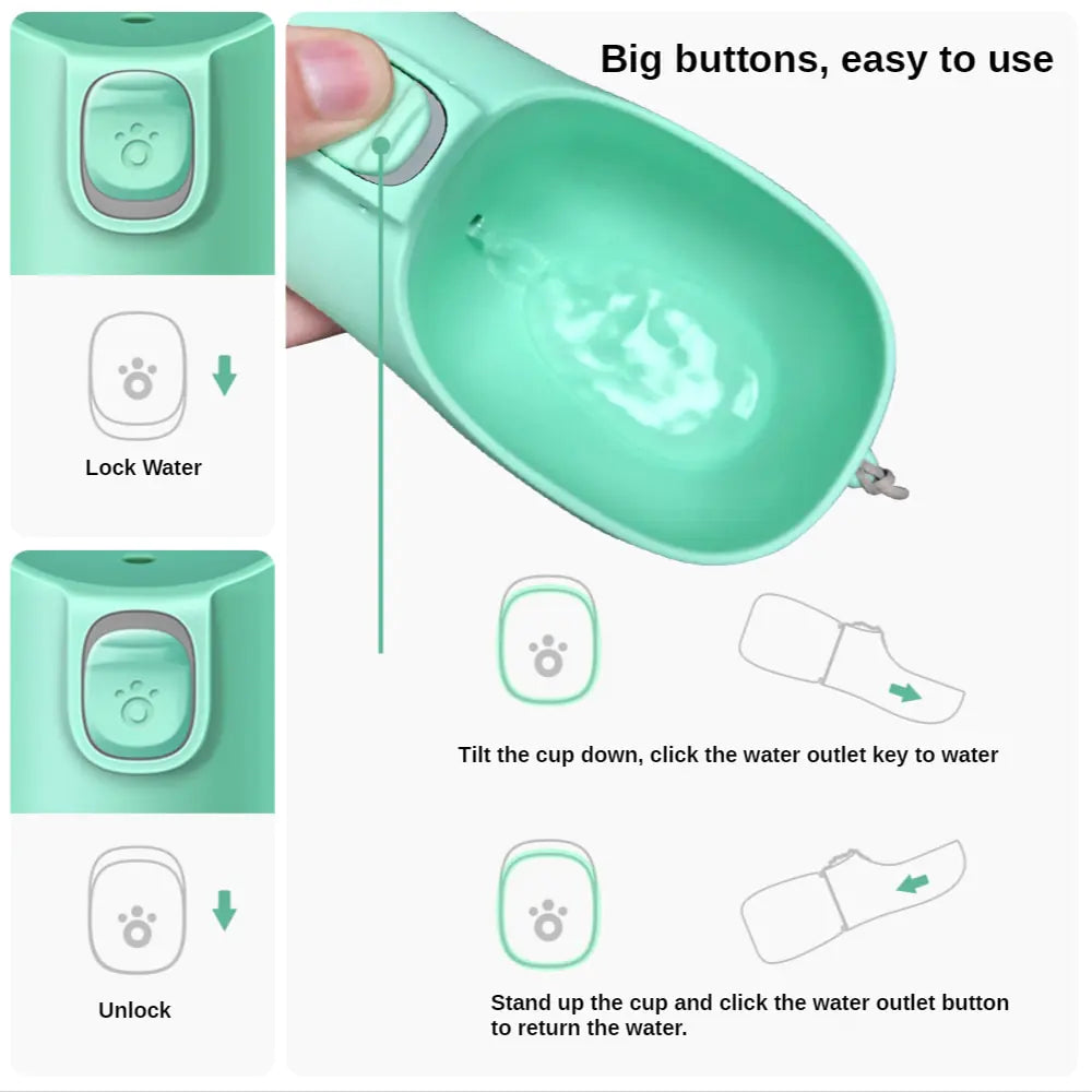 Designed with convenience in mind, our bottle features a Leakproof & Upgraded Big Button Lock Design, ensuring no precious water goes to waste during your adventures. With an enhanced button size, it's now easier than ever to provide your pup with a refreshing drink.